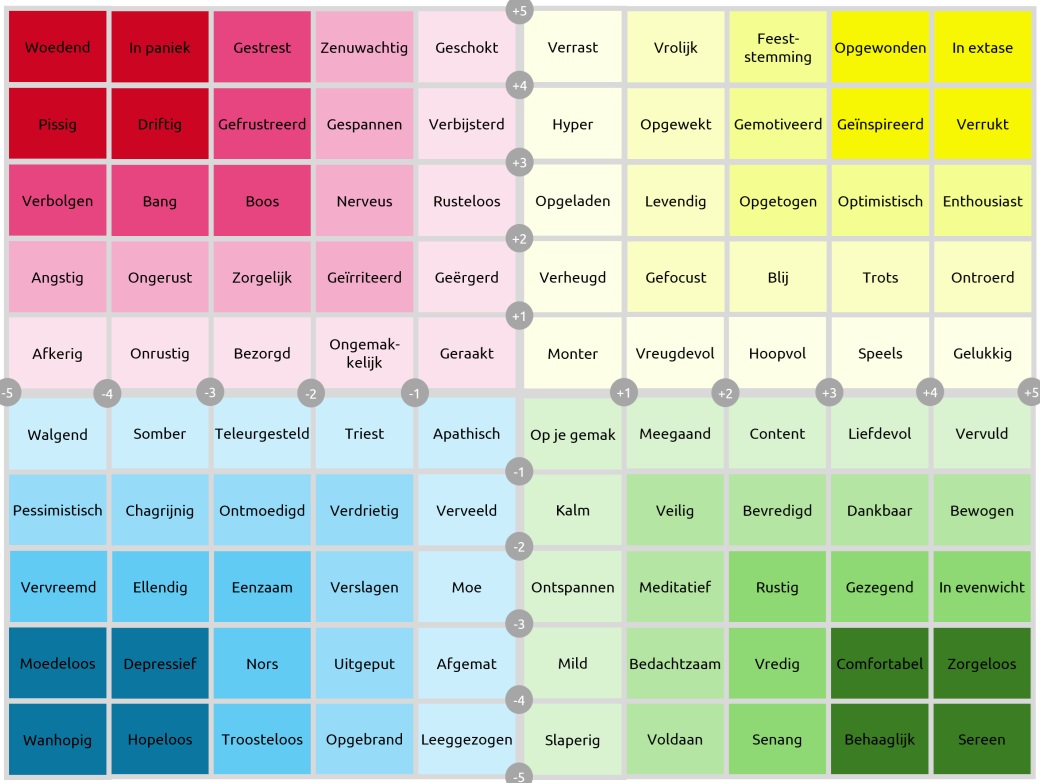 ![]() | De Moodmeter Voor een meer precieze beschrijving kan je kiezen uit 100 woorden die in de Moodmeter staan. Meestal lukt het je wel om een paar woorden vinden die jge gevoelens uitdrukken je hebt ervaren in de gebeurtenis. Die gevoelswoorden hoeven overigens niet dicht bij elkaar in dit schema te staan. Het hebben van ‘gemengde gevoelens’ in lijkt tegenstrijdig maar dat is het niet. Klik hier voor de Moodmeter |